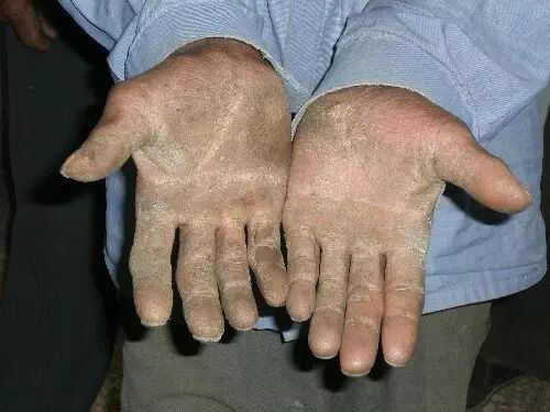 地方性砷中毒以皮肤损害为主,主要表现为掌拓部角化过度,末梢神经炎以及皮肤癌发病率增高以及等症状。患者开始表现为间歇性跛行,以后出现皮肤变黑,呈现褐色或黑褐色斑点,手掌和脚趾皮肤高度角化,可发展成皮肤癌。